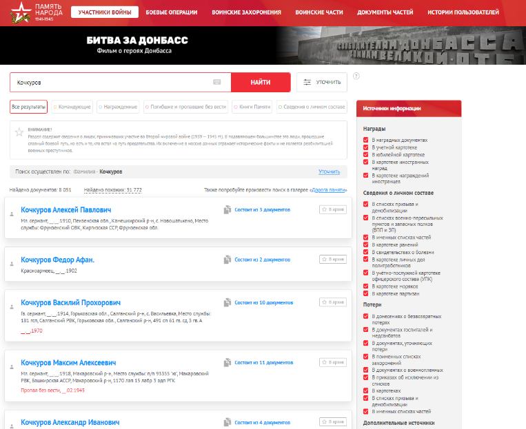 Память народа (https://pamyat-naroda.ru/?ysclid=m9x0eysv9a931047439) - крупнейший в мире Интернет-портал подлинных документов о Второй мировой 1939-1945 и Великой Отечественной войне 1941-1945.