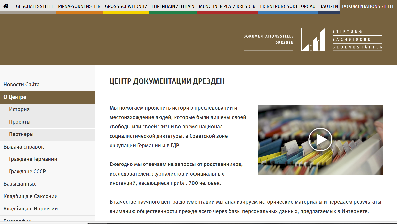 «Саксонские мемориалы» - Центр документации в Дрездене (Германия) — рабочий отдел Объединения Саксонских мемориалов. (https://ru.stsg.de/cms/dokstelle/content/o-tsentre/tsentr-dokumentatsii )